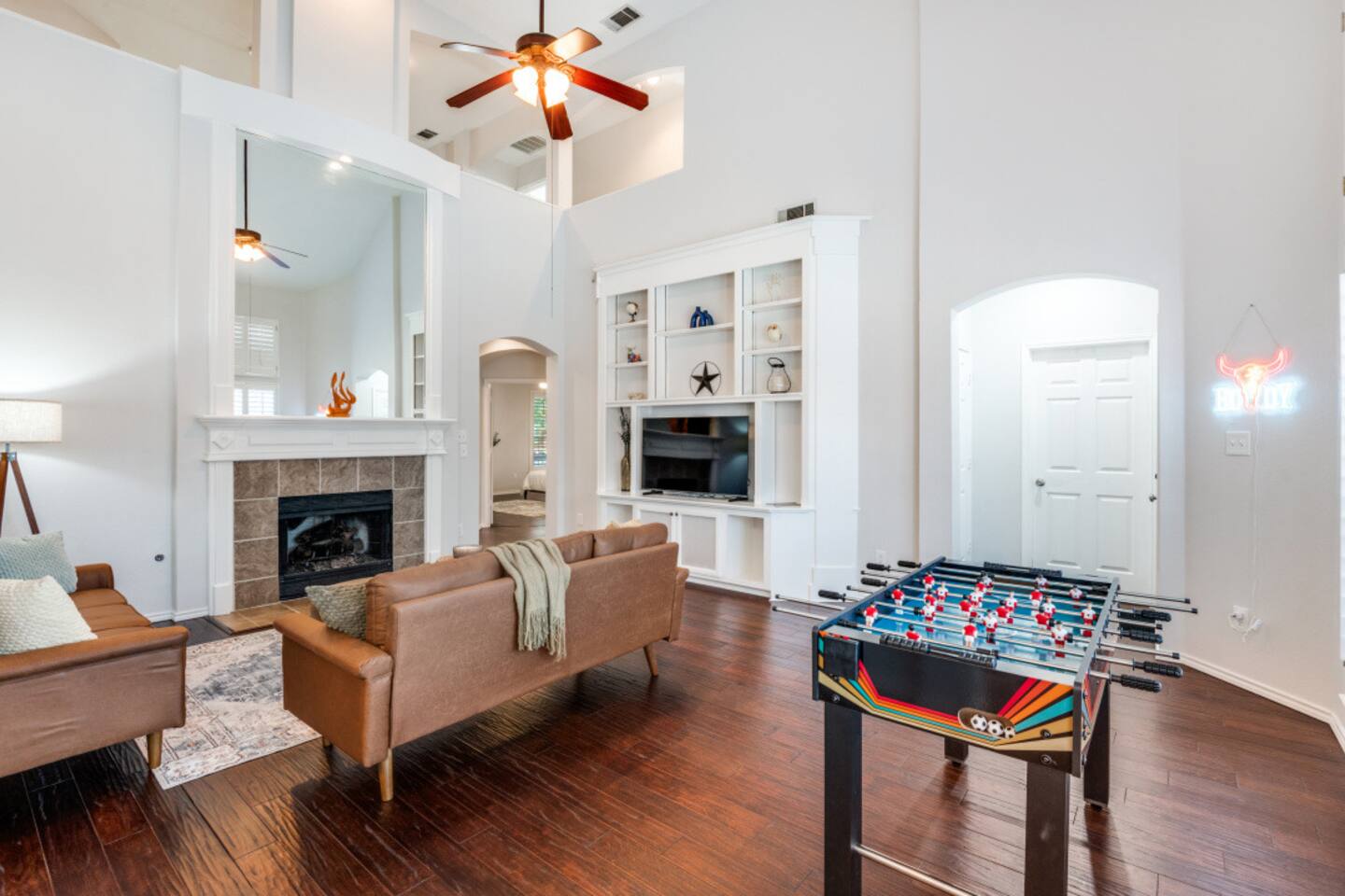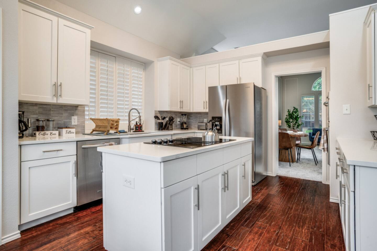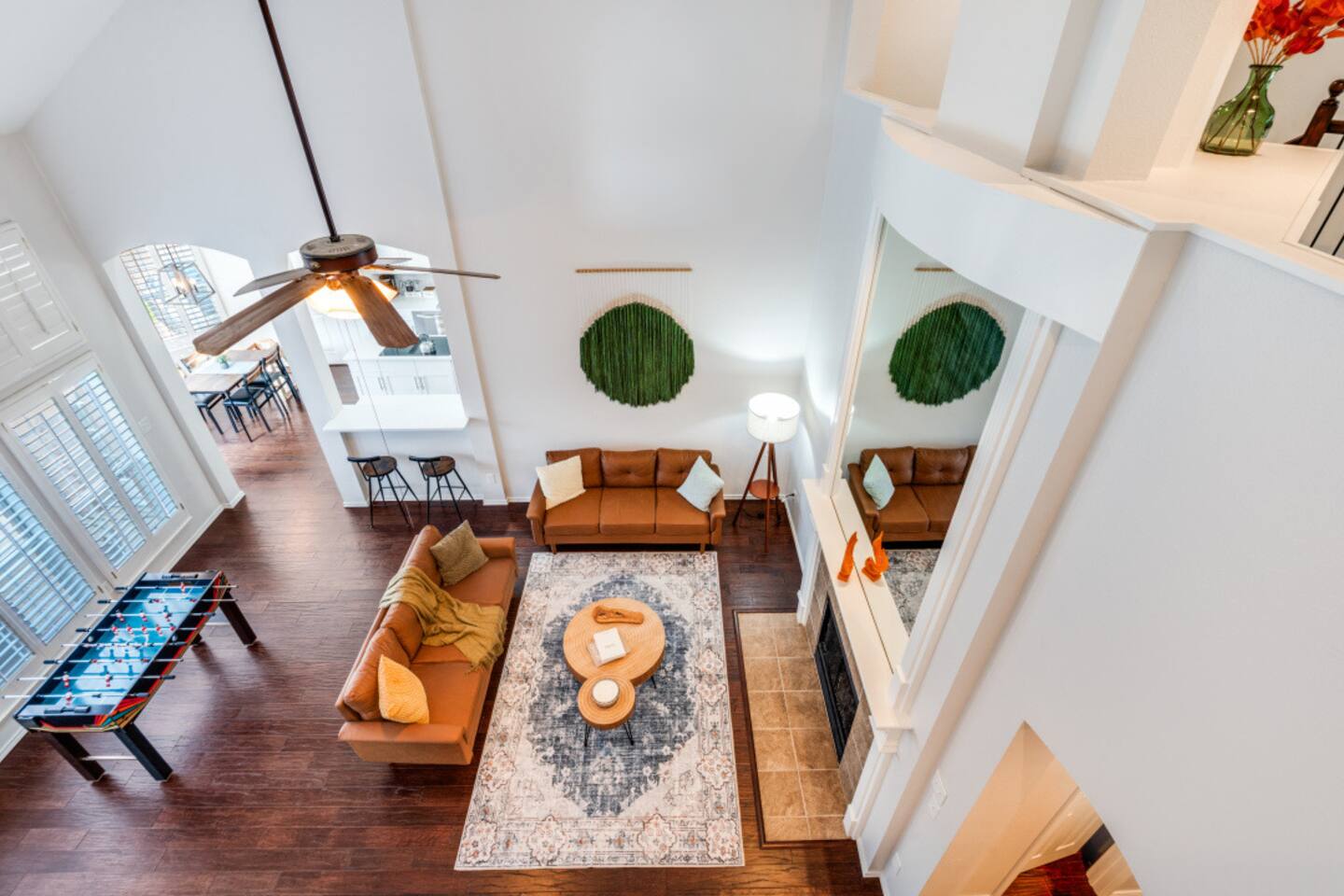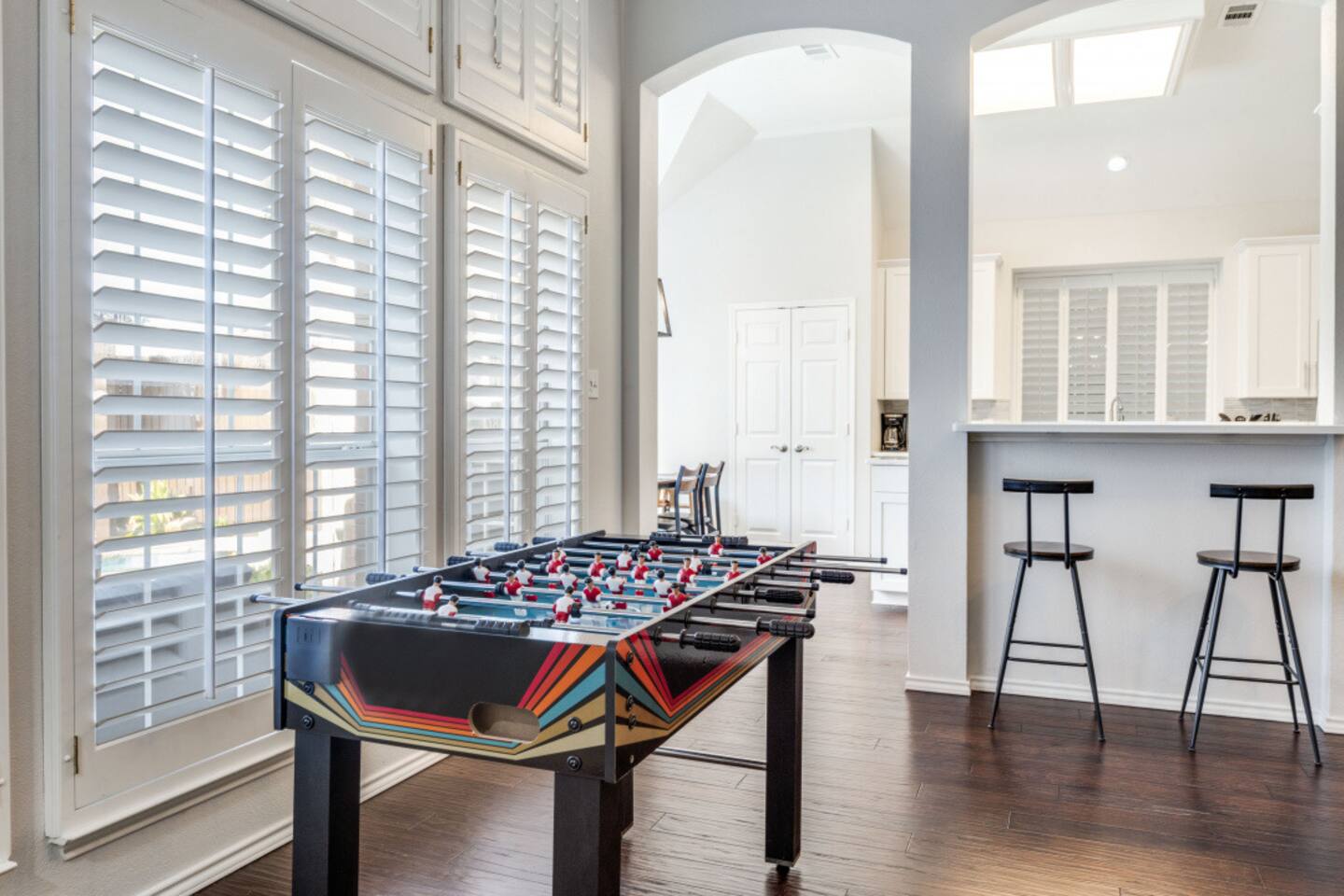 Escape to this charming 2,500 sq ft home, where modern comfort meets laid-back style. Designed for families and groups, the house offers a mix of fun, relaxation, and convenience. Enjoy a seamless check-in with your personal smart lock code, then relax in the heated spa (complimentary) and pool (heating available for an extra fee), or challenge your group to a game of foosball or board games in the comfortable living spaces. Amenities & Features -Heated Pool & Spa: Relax in the spa or cool off in the pool, surrounded by comfortable seating and a gas fire pit. Both the pool and spa are host-controlled. Just send us a message when you’re ready to soak! The complimentary spa runs in 6-hour intervals (5 hours of active use and a 1-hour break to refill to optimal levels). Entire pool heating available for an additional fee when air temperatures are above 50°F. Complimentary pool towels are provided. A Quick Winter Note: ❄️ To keep our pool and spa in top shape, the system features an automated "Safety Freeze Mode." If the air or water temperature dips below 42°F, the heater will shut off so the system can focus on circulating water to protect the plumbing. If you're visiting during a cold snap, please keep an eye on the forecast, as heating will be unavailable until temperatures rise back up! -Smart Lock Entry: For your security and convenience, access to the home is controlled by a smart lock. Your unique access code will be provided to you directly. -Game-Ready Spaces: Get competitive with a foosball table in the living room and a variety of board games in the cozy loft area. -Fully Equipped Kitchen: Cook with ease using the provided spices, coffee, and tea. The kitchen features a breakfast nook for 4 and a bar area with two stools, along with a full cocktail mixing station and recipes. -Outdoor Fun: A gas fire pit and a fully-equipped gas grill are ready for your BBQs and s'mores nights. -Convenient Amenities: A full laundry room with a washer, dryer, and supplies, plus high-speed Wi-Fi throughout the house. Sleeping Arrangements Rest easy! Our home is designed to comfortably sleep up to 8 guests across its 4 bedrooms and 2.5 bathrooms, each with a private closet. 🛏️ Master Bedroom (1st floor): King bed, smart TV, and a dedicated workspace with a desk, chair, and lamp. 🛏️ Bedroom 2 (2nd floor): Queen bed and a dedicated workspace. 🛏️ Bedroom 3 (2nd floor): Queen bed. 🛏️ Bedroom 4 (2nd floor): Two twin beds. More Details -Living Room: Smart TV, foosball table, board games, and comfortable seating. -Loft Area: Golf Putting Green and comfortable seating. -Dining Areas: A main dining table that seats 8 and a breakfast nook that seats 4. We believe a great stay is about more than just a place to sleep—it's about the memories you create. Our home combines thoughtful amenities with a comfortable and convenient setting, perfect for family getaways, special celebrations, or a relaxing escape with friends. For our corporate guests, we've ensured every detail is in place to make your trip both productive and comfortable. We're always here to help. If you have any questions or need anything at all, please feel free to reach out. We look forward to helping you create an unforgettable experience!