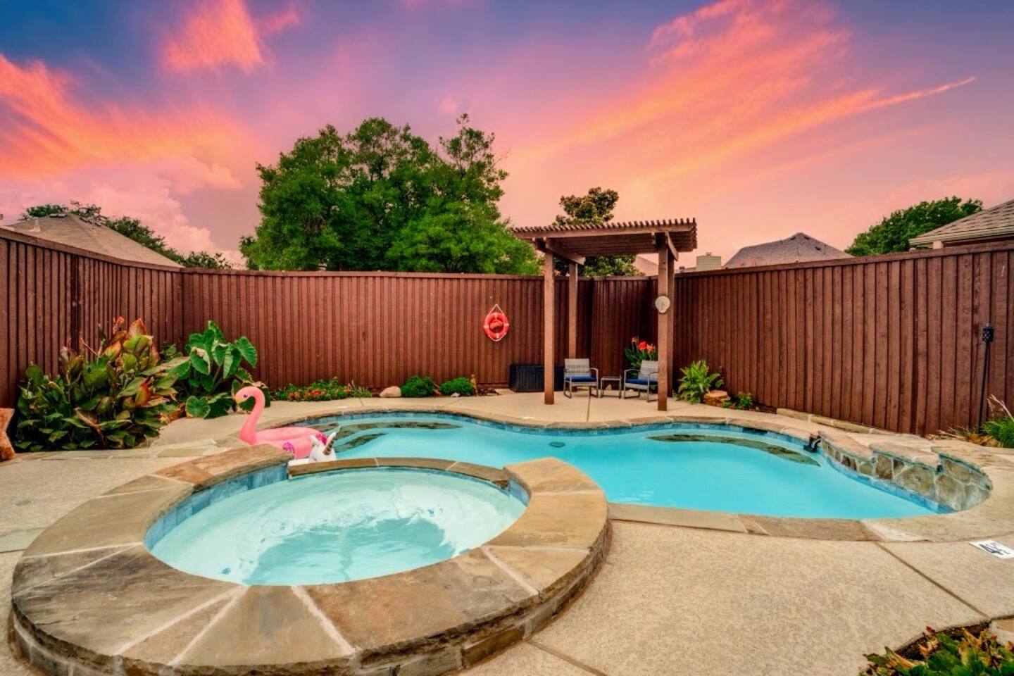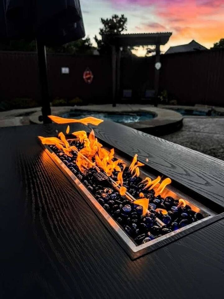 Escape to our stylish 2,500 sq ft Frisco retreat for 8! This 4-bed home is perfect for families & corporate stays. Enjoy your own private pool, heated spa, gas fire pit, and putting green. Centrally located near The Star, this home offers a perfect blend of relaxation and entertainment. Features a fully equipped kitchen, dedicated workspaces, and smart lock entry for a seamless stay.